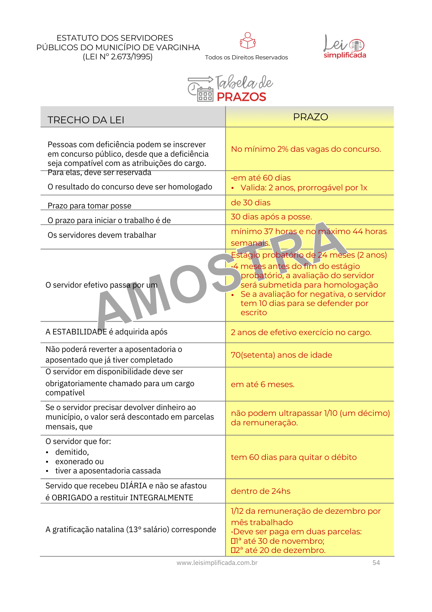 É uma tabela exclusiva e organizada com todos os prazos, datas, percentuais, períodos e números importantes previstos na legislação que você está estudando — tudo em um só lugar!